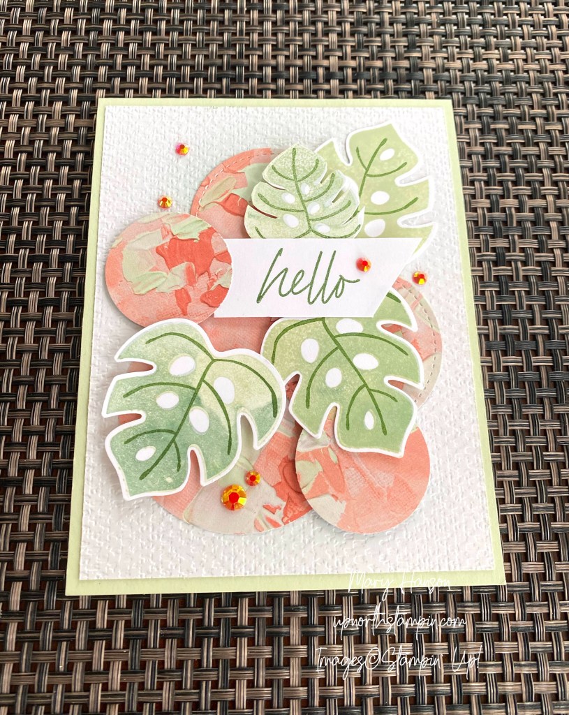 I adhered the circles onto the card front, some with Stampin’ Dimensionals. I then stamped four leaves from Tropical Leaf stamp set onto a scrap piece of Basic White card stock with Soft Seafoam. Before stamping, I also added some Evening Evergreen ink directly on to the stamp with a blending brush. It was so fun to try this! After stamping, I punched three large leaves out, using the punch, and then fussy cut one smaller leaf.