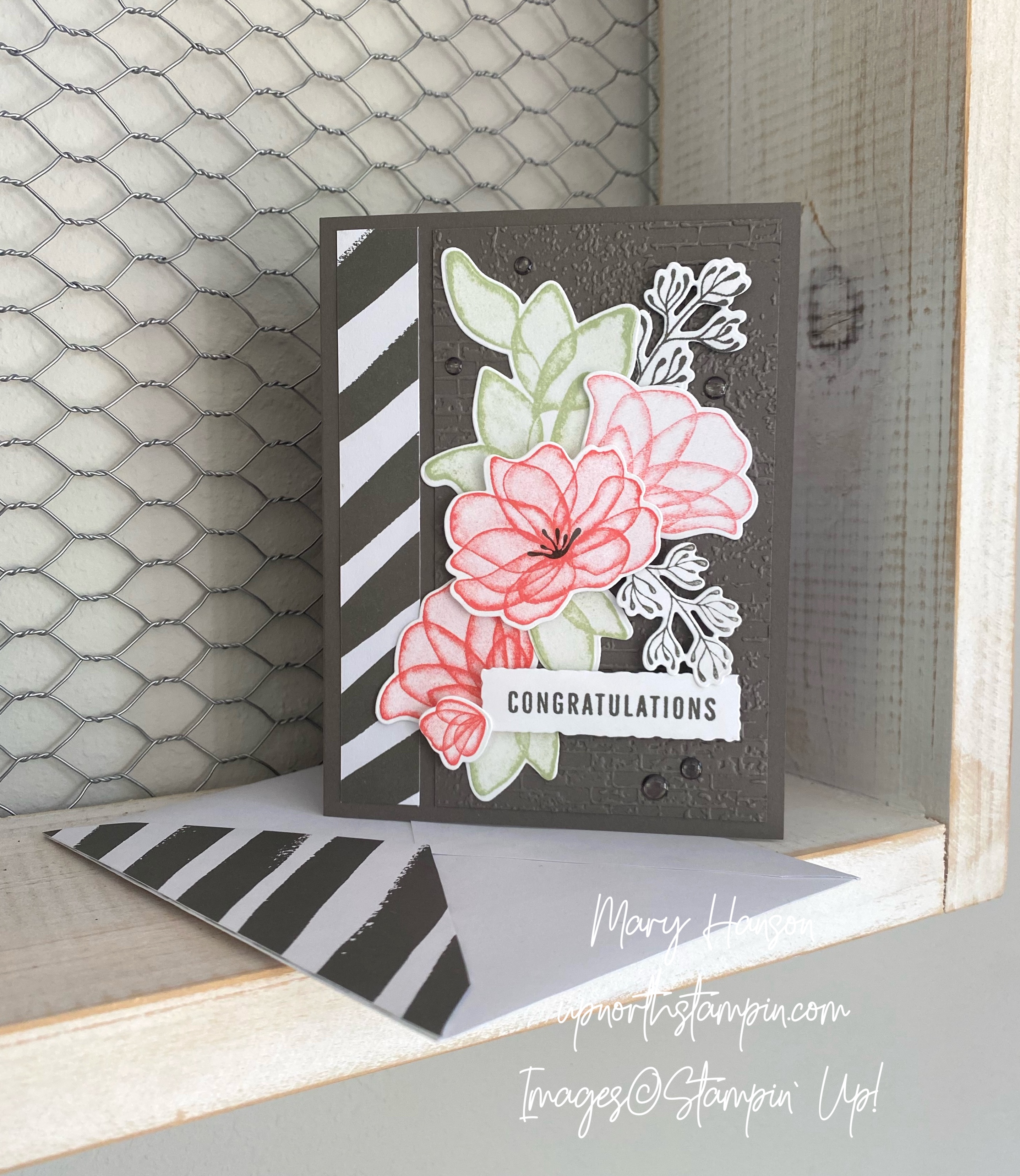Mary, I can’t say enough about how much I love this card. The mix of dramatic colors and shapes mixed with the airy floral focal point is beautiful!