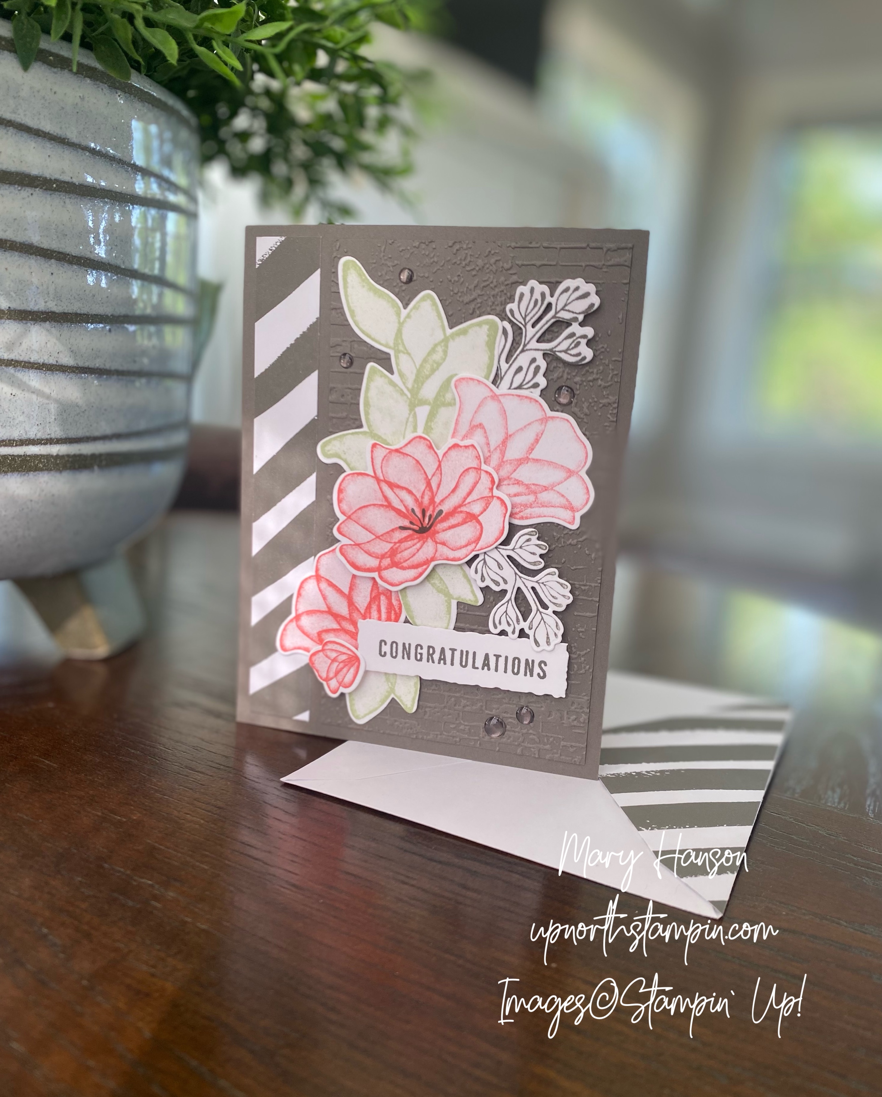 This stamp set and dies bundle, Translucent Florals, will be available in the upcoming Mini Catalog, coming out later this summer. I thought it would be fun to create some projects to give a sneak peek to customers, and get myself acclimated. The beautiful stamps are different, in that they create a ‘translucent’ effect with a darker outline around the flowers and leaves. I just love it!