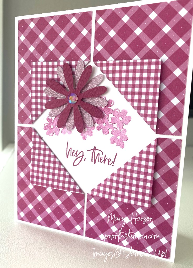 I love the Glorious Gingham Designer Series Papers (and don’t forget the DSP’s are on sale!). I couldn’t wait to try this card technique that I saw from Lisa Curcio. The possibilities are endless with the little peek-a-boo diamond in the center of the card: