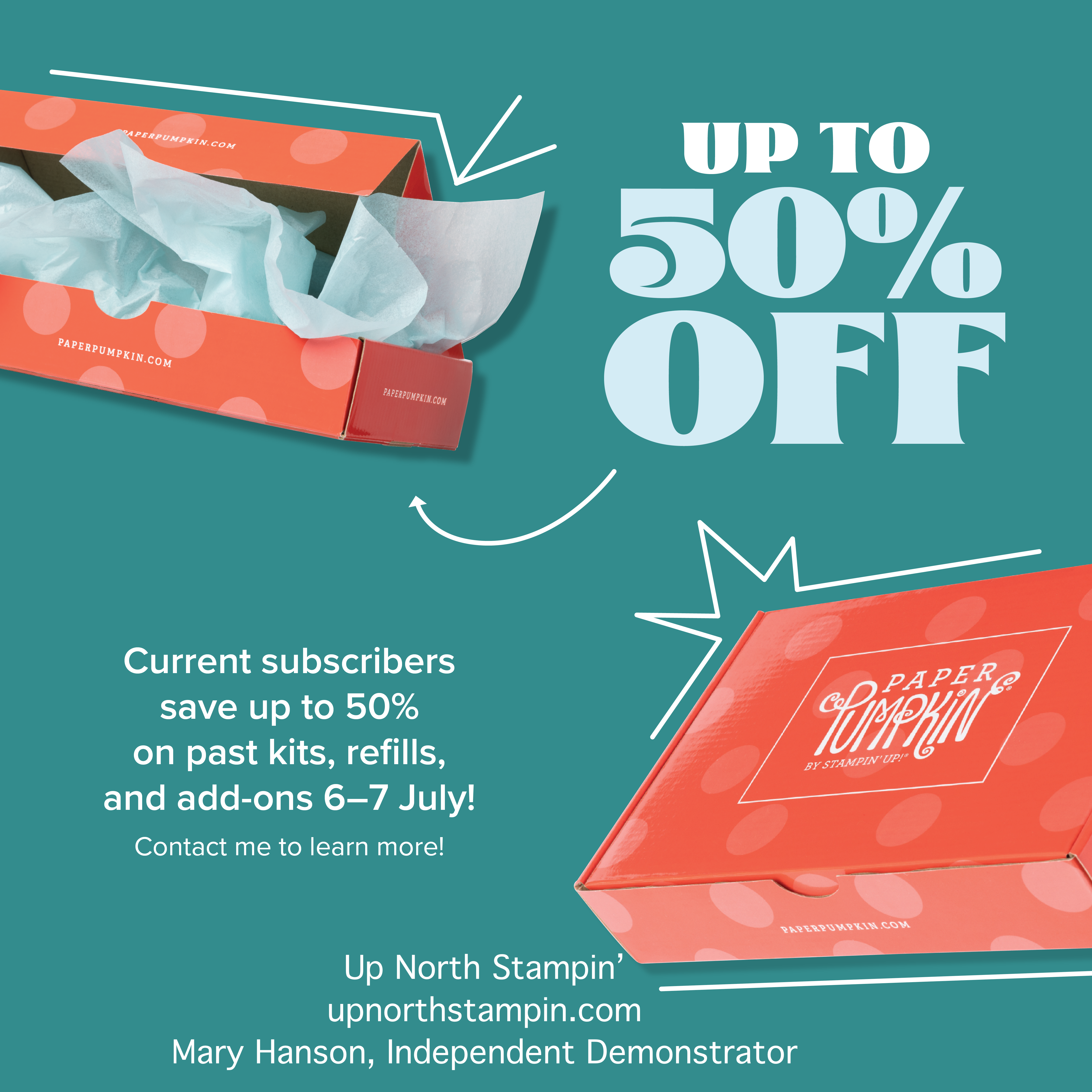 Surprise! On 6–7 July, all current Paper Pumpkin subscribers can save up to 50% on Paper Pumpkin past kits, refills, and add-ons!