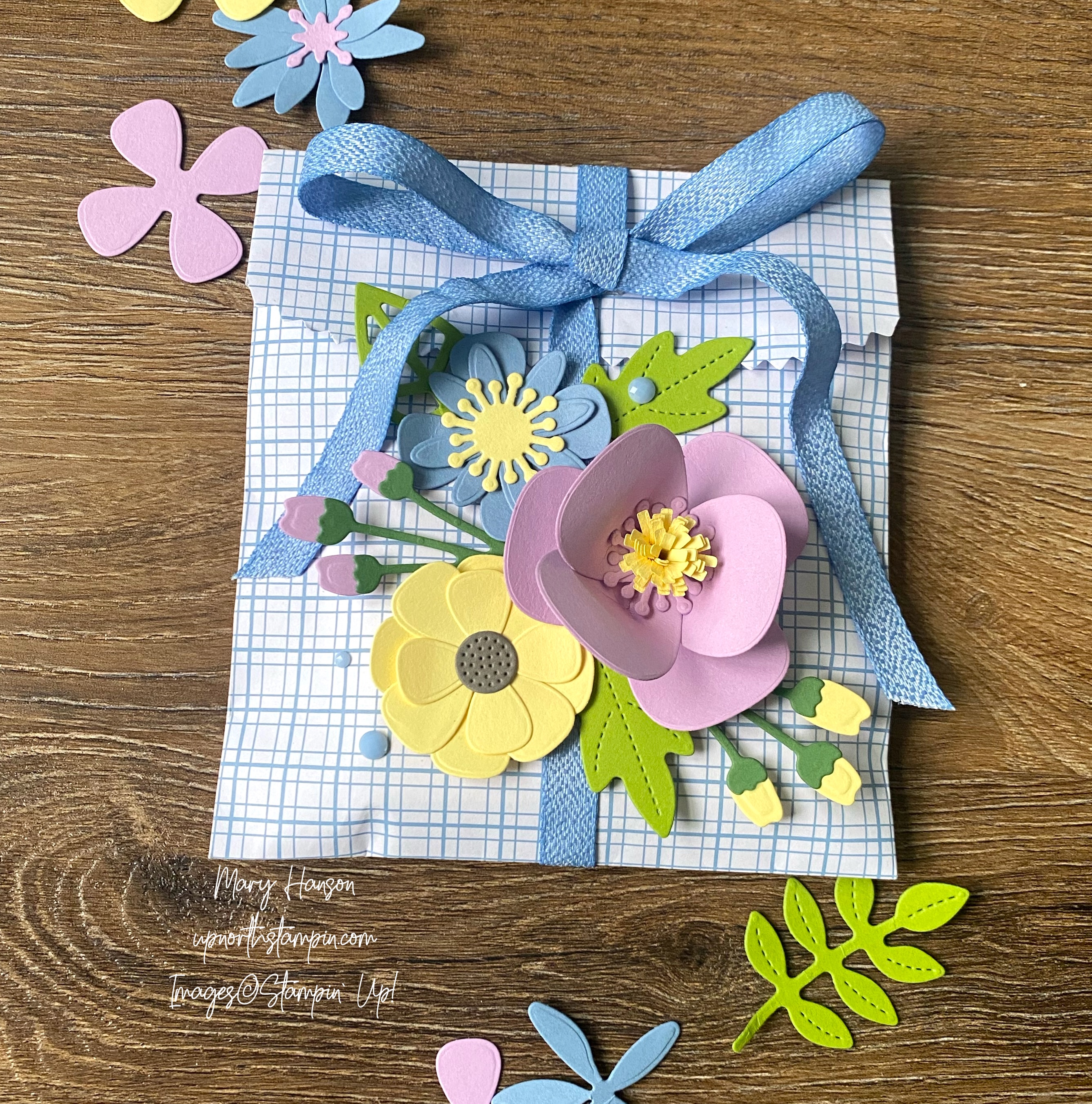 I chose a Boho Blue bag, and an entirely different set of dies for my CASE: the Paper Florist Dies. The possibilities are endless as you create all kinds of flowers using different combinations of the die pieces. Here’s my project: