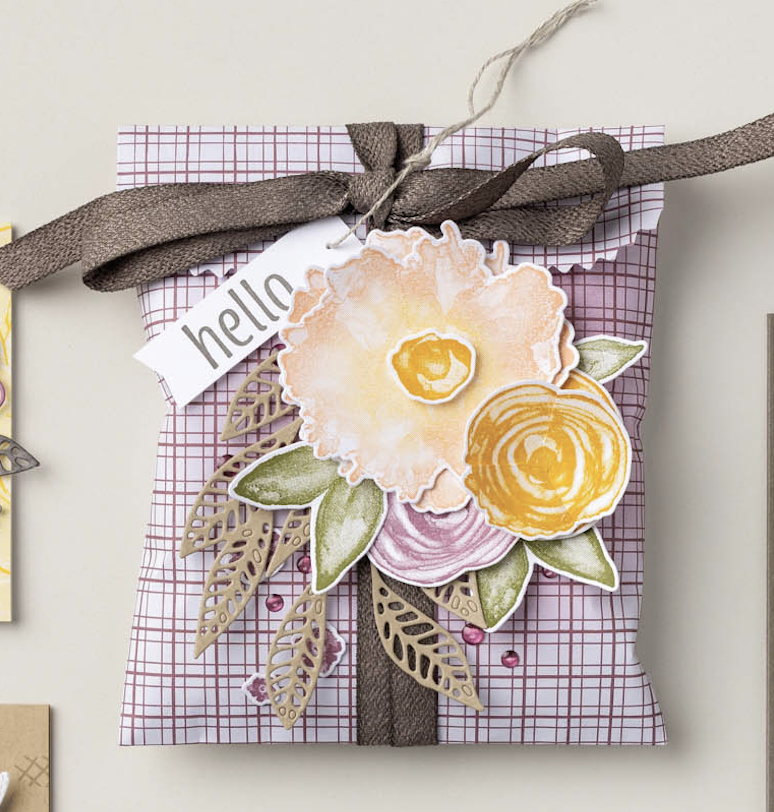 I adhered the flowers and leaves with glue dots, and white glue — it’s very much whichever you prefer! Because these flowers can be quite “3D,” a treat bag like this can really work, because you have your gift already wrapped, so no need for an envelope! The flowers can stick up as much as you want!