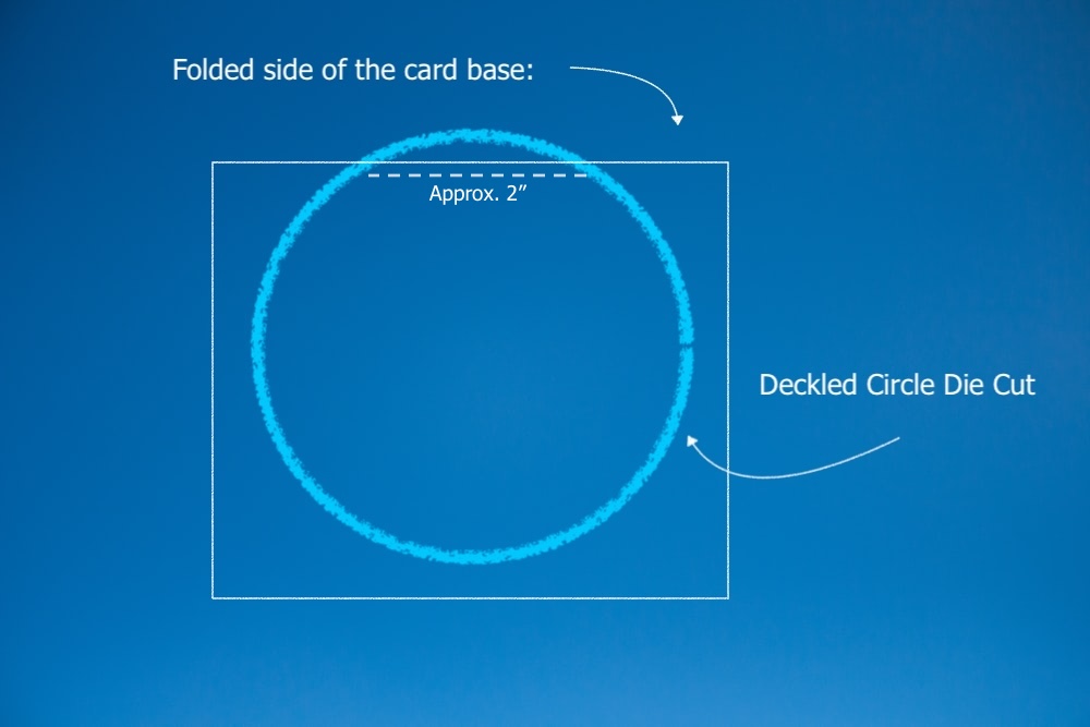 Start with a piece of cardstock, cut at 5 1/2″ by 11″ and scored at 5 1/2″, so it’s a square card. You must obviously leave a fold portion as you cut with a circle die, so take a deckled circles die that’s almost as big as the square. Center the Circles Die over the square, and then pull it back so the FOLD side of the card is slightly inside the circle die, so about two inches of the fold will NOT get cut by the circle die. This will leave you with a folded side.