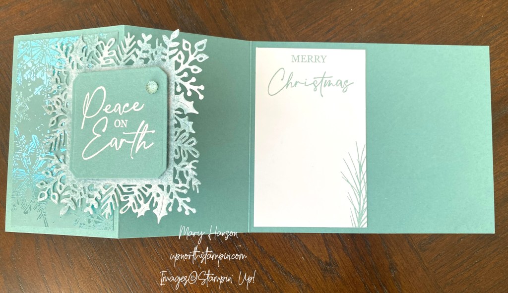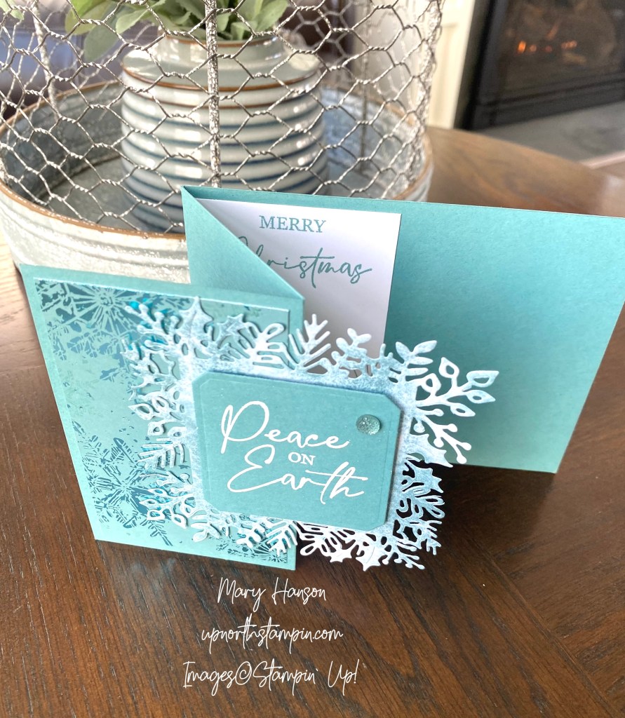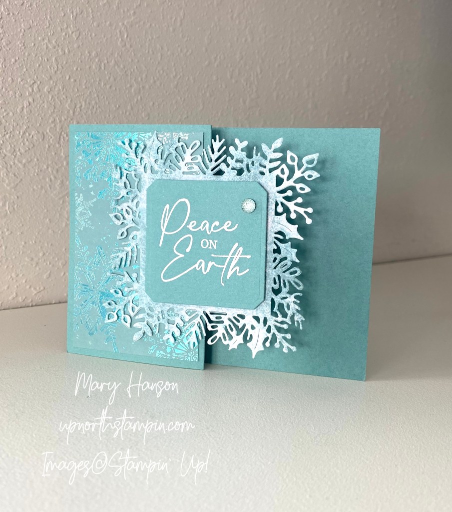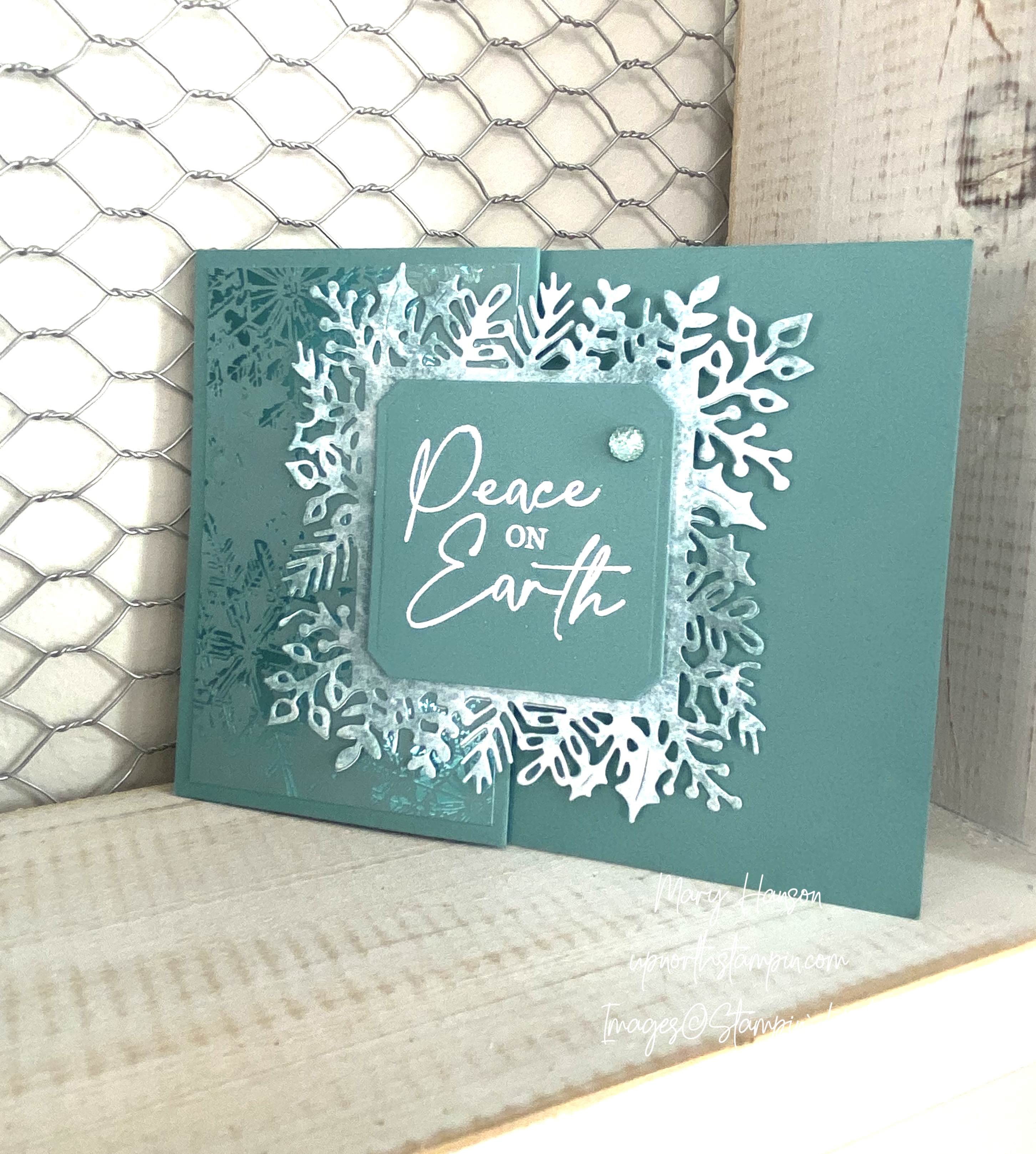 Home for the Holidays evokes such a peaceful and wintery feeling for me. So I chose the Classic Christmas bundle with the gorgeous and shiny Snowflake Magic Specialty Designer Paper to create a ‘magical’ winter holiday feel.