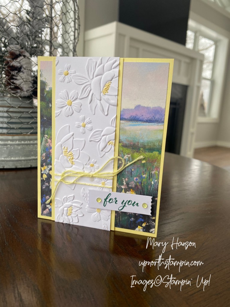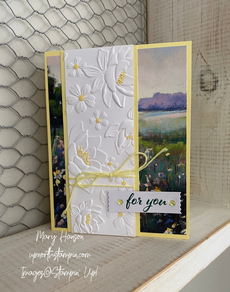 I made another card using the Layered Florals 3D Embossing Folder in the new January-April Mini Catalog from Stampin’ Up! This one also uses the Meandering Meadows Designer Series Papers. The scene shows white flowers with yellow centers, so I tried to pick up on those flowers in an embossed panel on the front of the card: