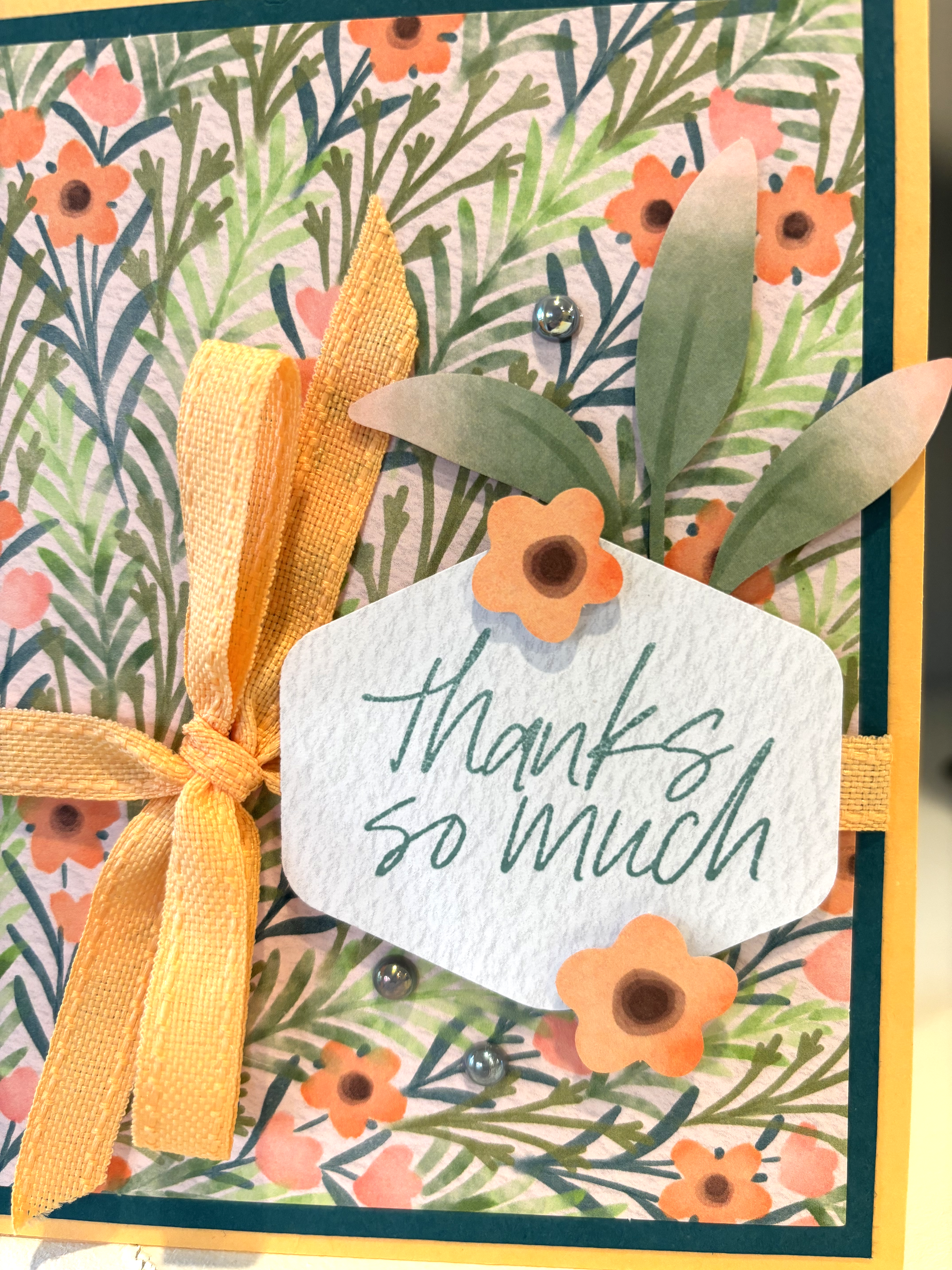 Before adhering the top layers to the card base, I wrapped a length of Peach Pie ribbon around the layers and tied it in front. I then adhered those layers to the card front. I punched a sentiment panel using the Hexagon Punch and a scrap from the inside of one of the wreaths of the DSP! So handy, and so pretty because it matches!