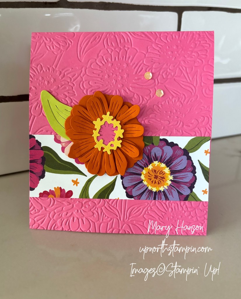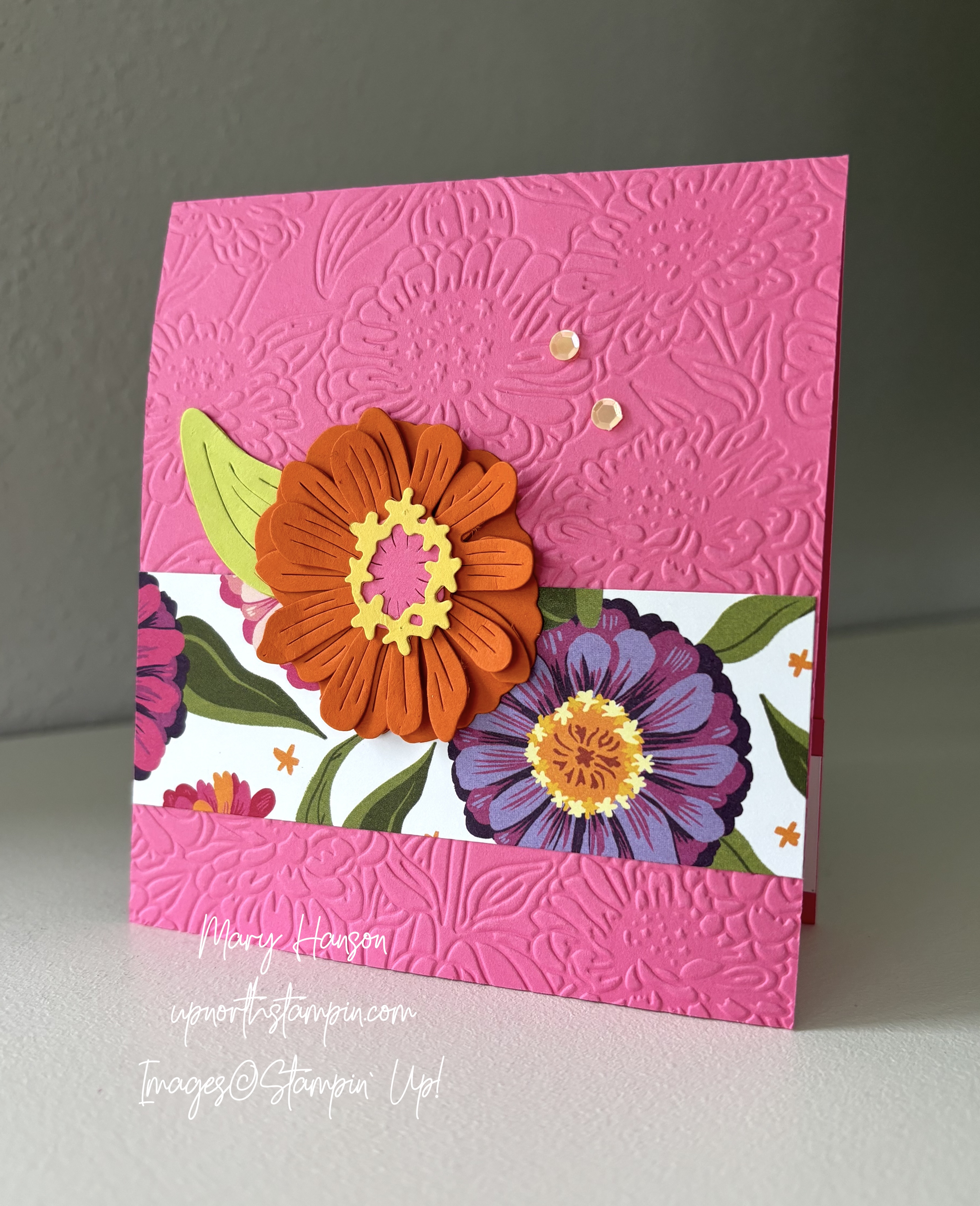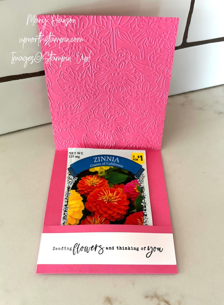 The Flowering Zinnias Suite continues to delight papercrafters with its zinnia stamps and dies, along with bright and beautiful Designer Series Papers and a zinnia embossing folder. I seriously can’t get enough of the entire suite! Here is a project I made as a card with a fun surprise inside!