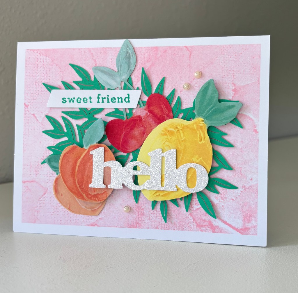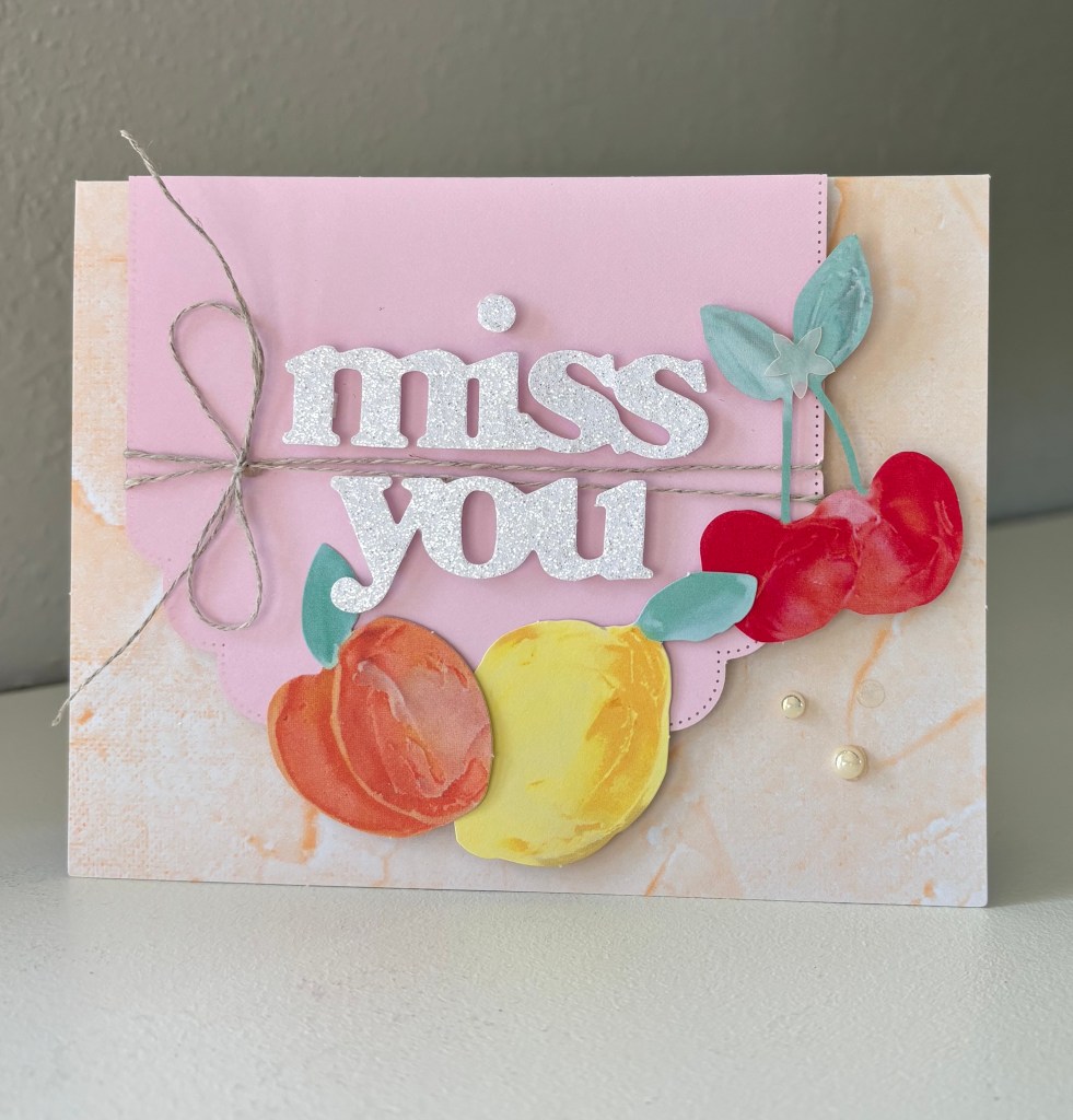I had a bushel of fun creating the June Paper Pumpkin kit! It was full of ingredients to make nine beautiful cards, complete with watercolor fruit images and sparkly glitter sentiments! I had fun mixing and matching all the ingredients and adding to the nine card bases. Here are some of the cards I made!