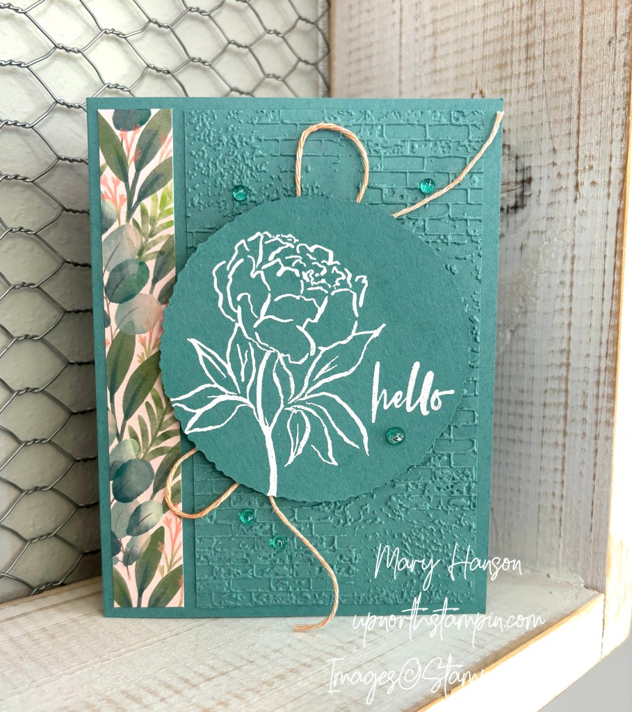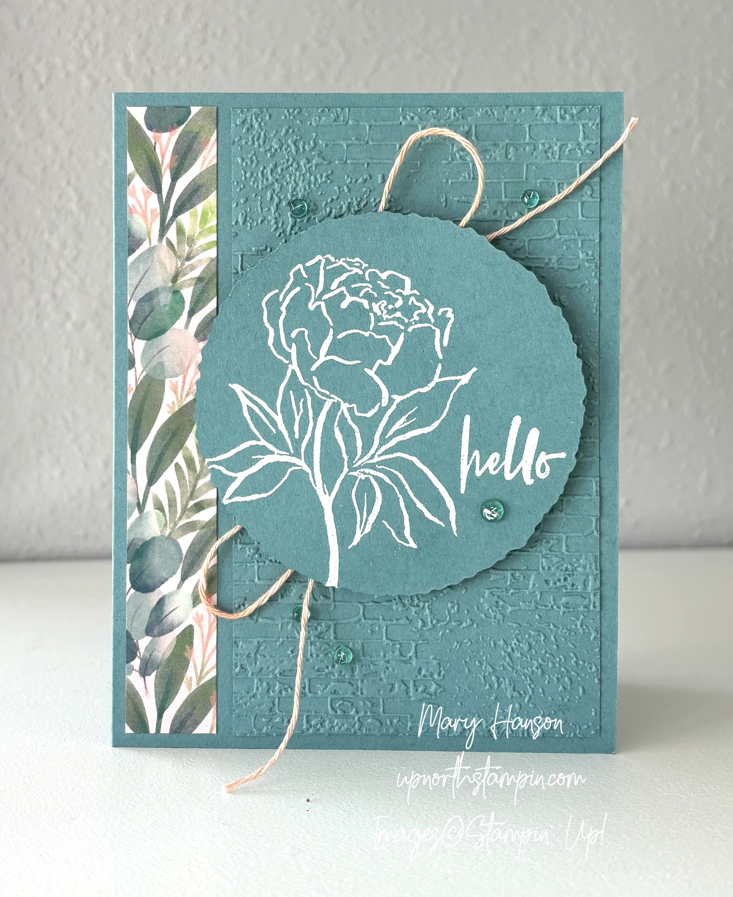 - Cut Deckled Circle die in Lost Lagoon. Heat emboss peony stamp and sentiment on circle using white embossing powder.