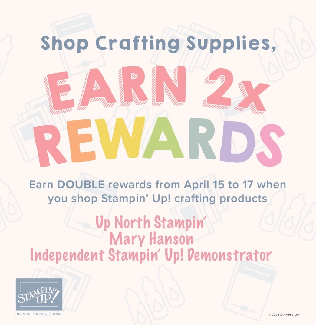 This just in: Stampin’ Up! is offering three days of Double Stampin’ Rewards! That means you place any order over $20 and receive 2 TIMES the rewards. On a $50 order, instead of $5, you will get $10 in rewards to spend on your next order, eligible for up to a year!