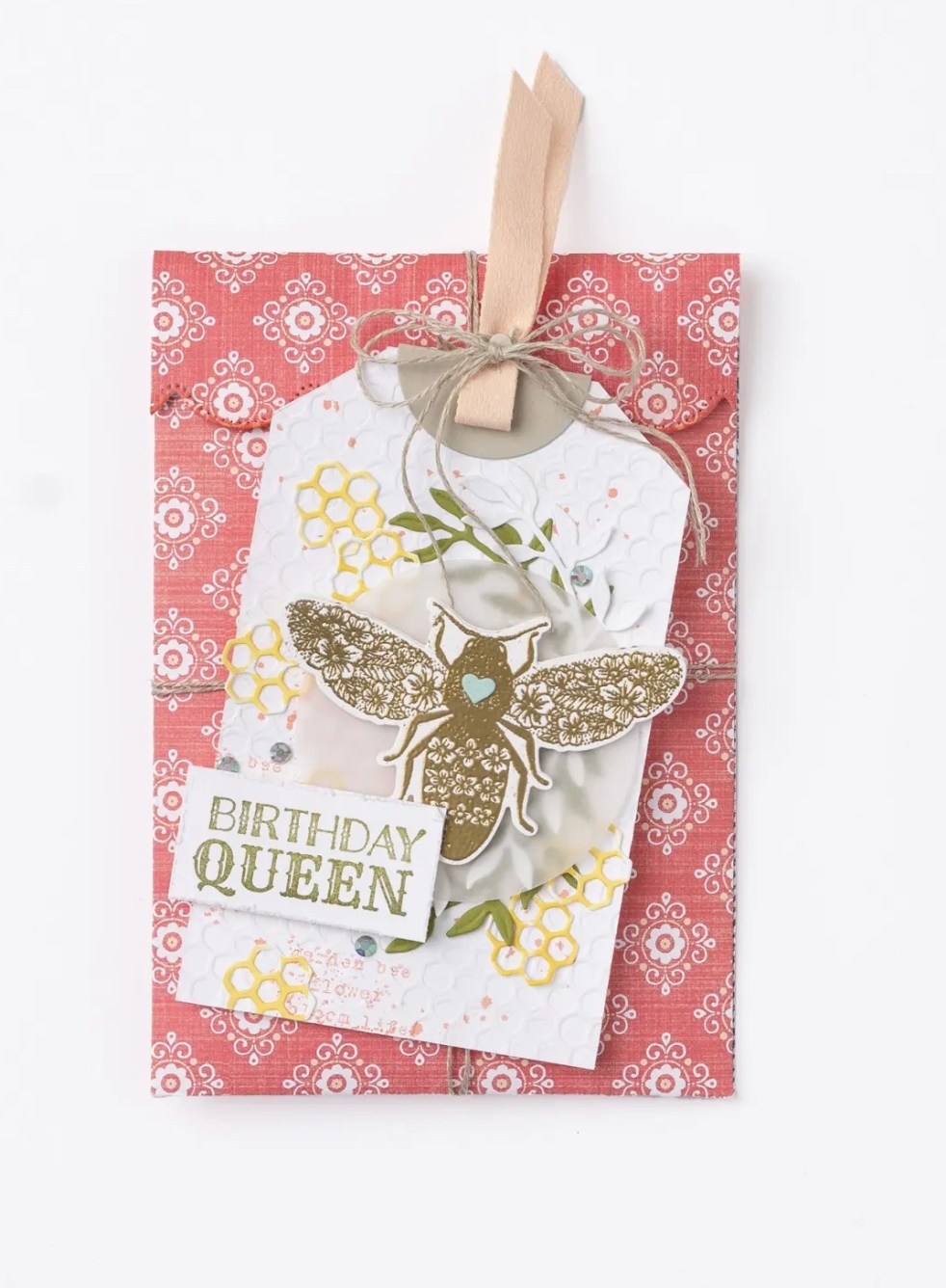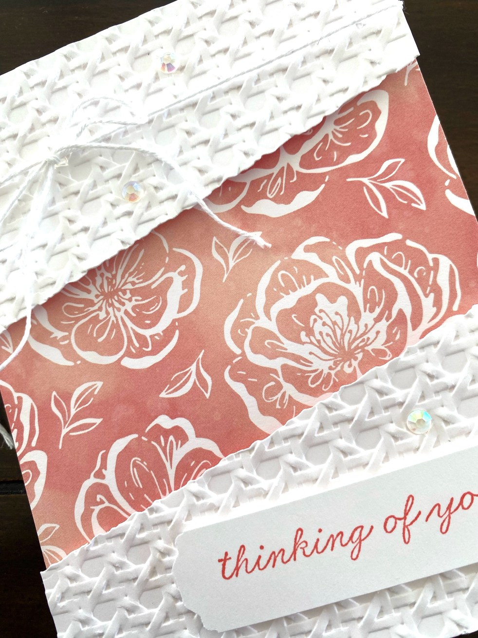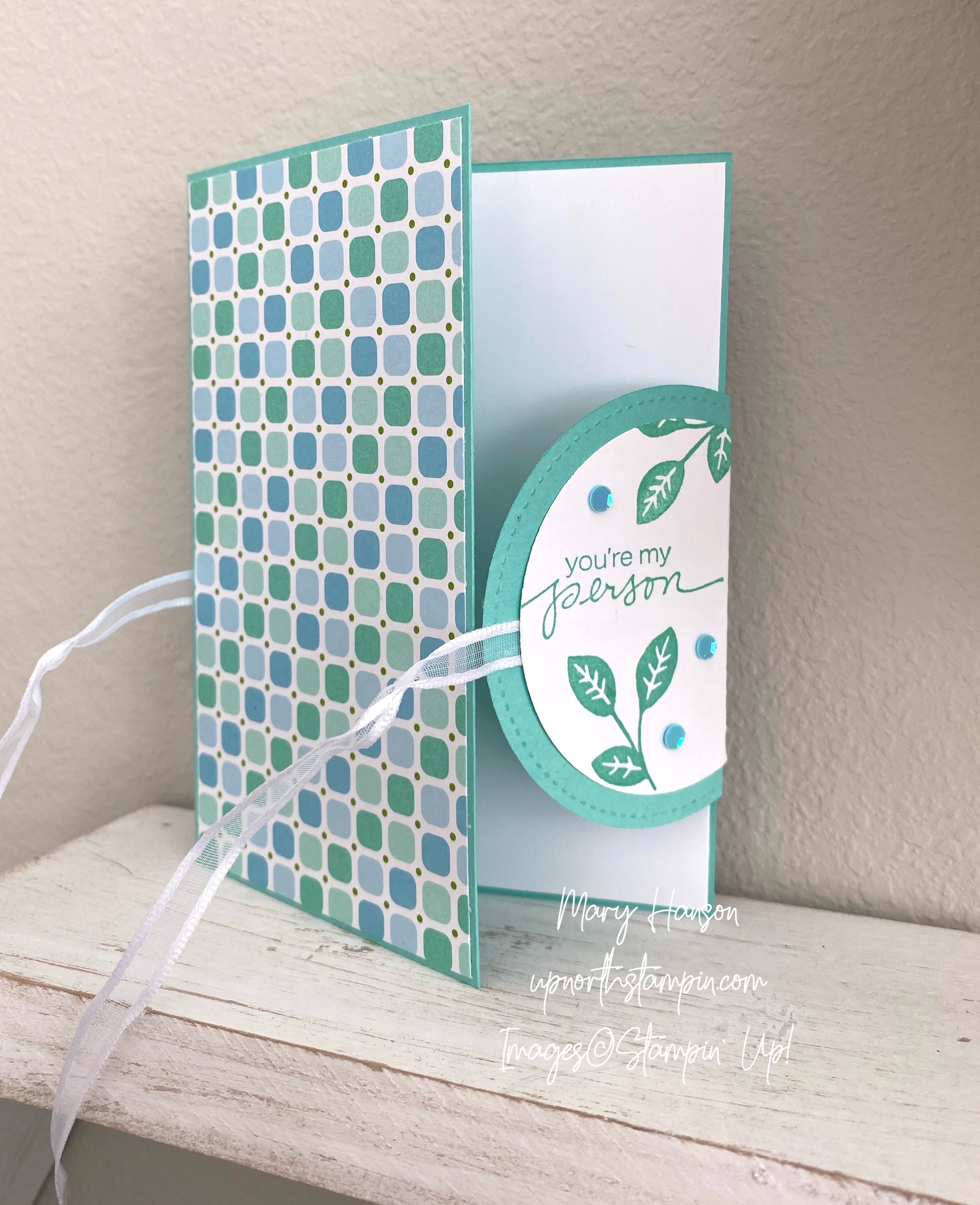 The two pieces of ribbon were glued between layers of the card on the left before adhering the DSP onto the top, and the two layers of the circles, using Tear and Tape to make sure it’s good and sticky!