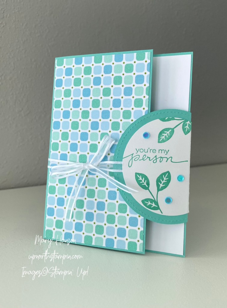 So I had some fun deconstructing her card and creating one of my own using the soon-to-be-retired Lovely You Stamp Set, found in the SU! Annual Catalog. Here’s my card: