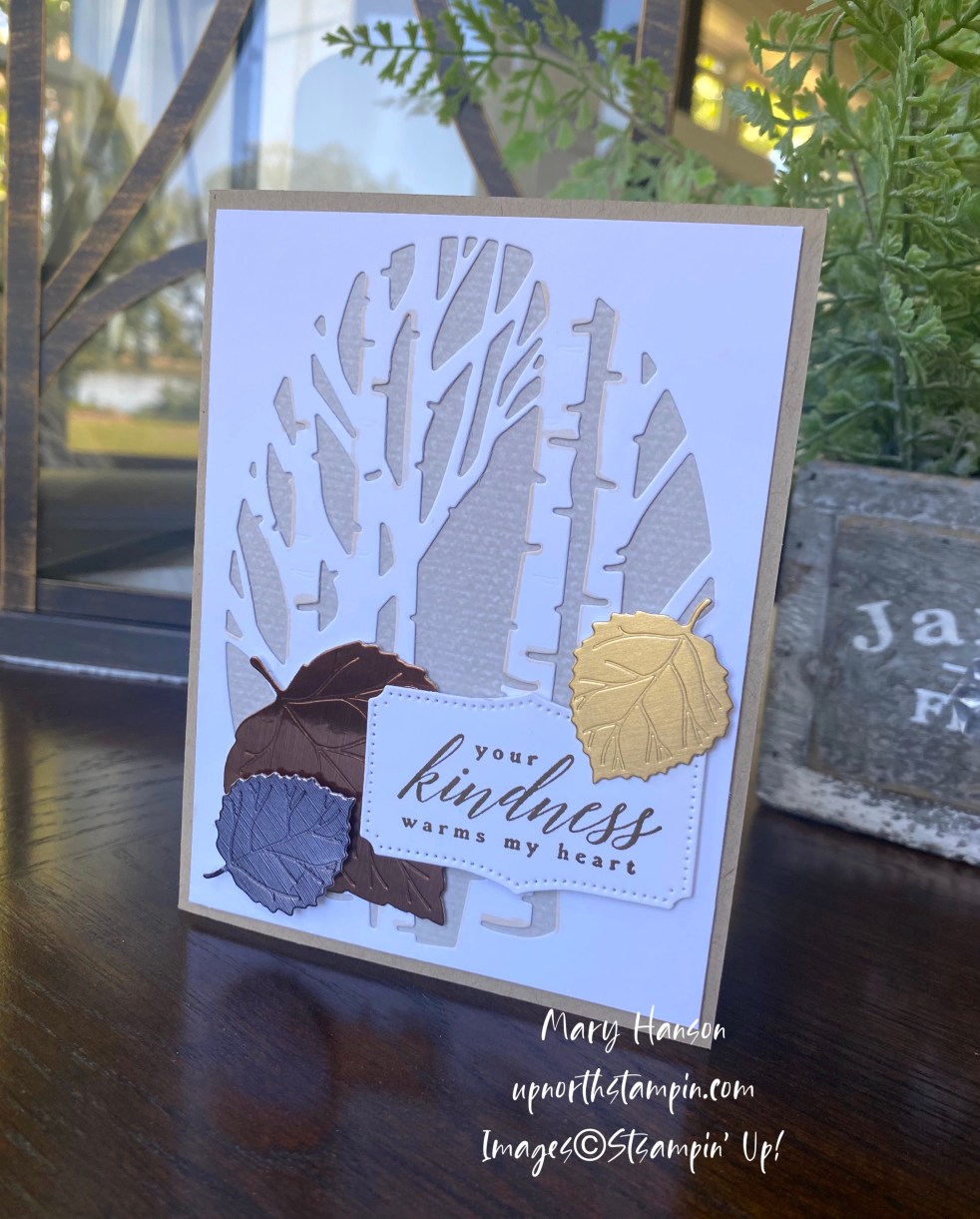 This gorgeous bundle is going to be perfect for early Autumn, Autumn, and then right into the winter and of course, Christmas. That’s how versatile it’s going to be! The stamp set has beautiful sentiments, and the cutest little bird! The dies include some embossed leaves, a pretty branch for the bird to sit on, AND the aspen tree framed die, which I adore! Check it out: