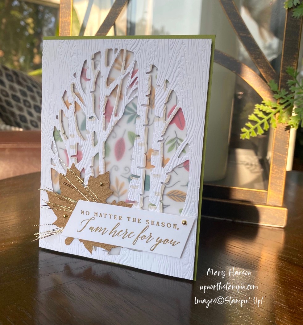 Yesterday, I featured my first card using the new Perched in a Tree Bundle, featuring a cute bird, beautiful leaf dies, and a background die that reminds me of our own land, filled with woods and beautiful trails. Here’s my second card, with a flavor of Autumn, which is right around the corner for us in Northern Minnesota.