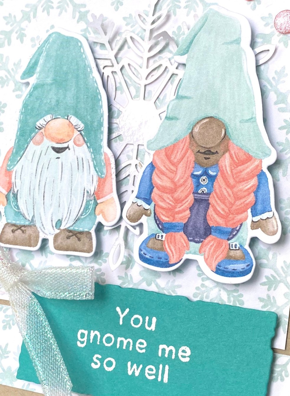 The background paper is from the Storybook Gnomes Designer Series papers. The designs include snowflakes and winter backgrounds, as well as some gnome and wildlife scenes. They also include two sheets of various gnomes that will cut out using the dies in the bundles. OH — and mushrooms, too! OR you can stamp and color your own gnomes and then cut them out using the dies. Super CUTE!!