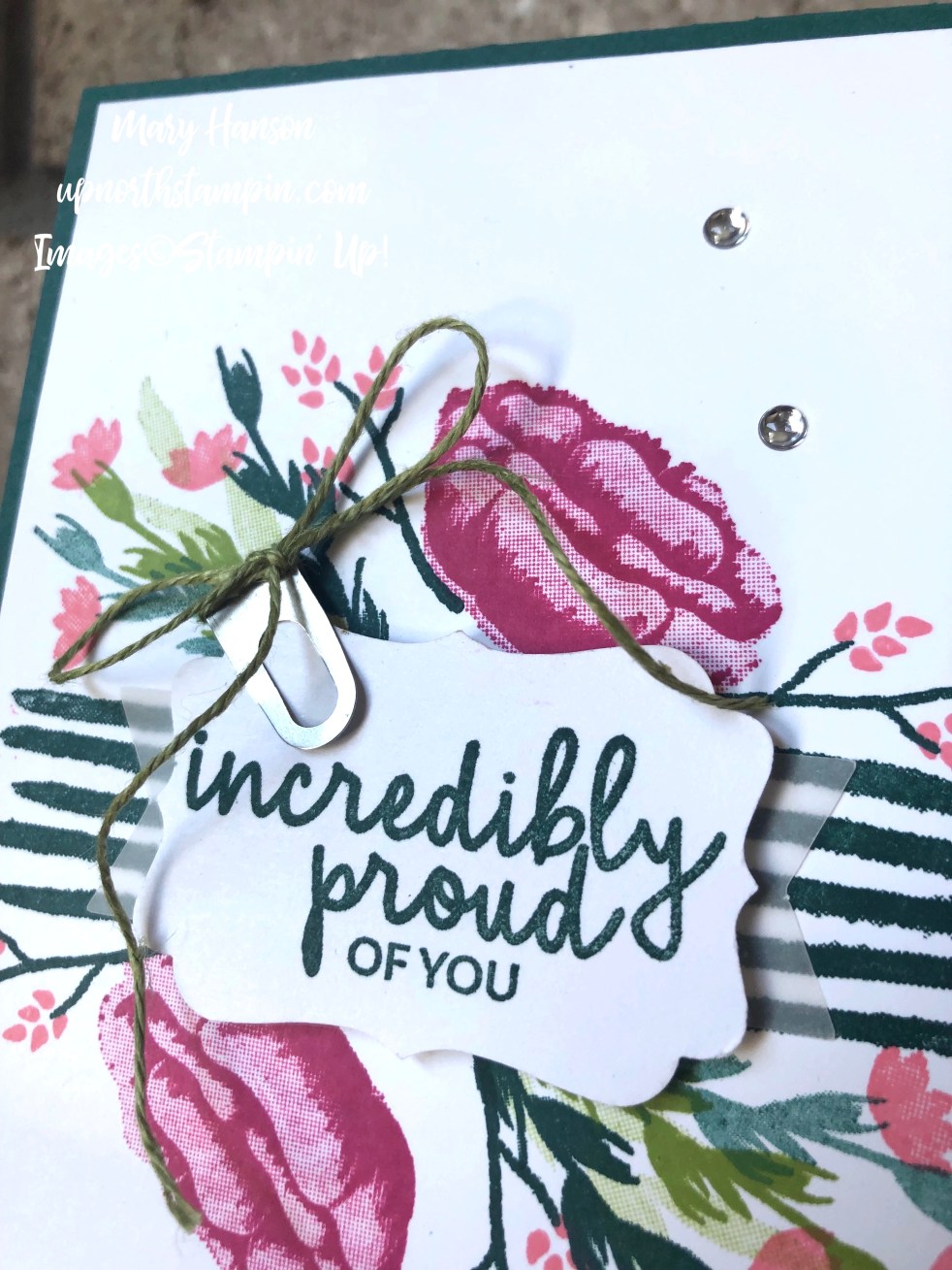 That’s what I did with this card — I used some beautiful rich Stampin’ Up! colors to stamp a pretty bouquet on a base of Tranquil Tide card stock, an In Color that is just about to retire in a short time. I used the “Incredible Like You” photopolymer stamp set to create my floral background. See below for the colors and supplies. Click on any supply to order with me!