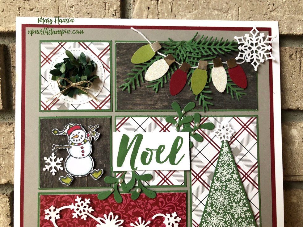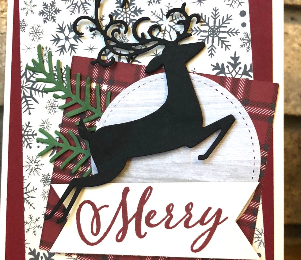 The Sentiment—I used the new stamp set called “Winter Woods” for the sentiment. The fonts are beautiful! I used Merry Merlot ink onto a 2-1/2″ x 2-1/2″ piece of Whisper White cardstock, then mounted it onto a 2-5/8″ x 2-5/8″ layer of a Merry Merlot with SNAIL and popped it up onto a 3″ x 3″ Copper Glimmer paper layer from the Joyous Noel Designer Series Paper. The whole sentiment piece was adhered onto one half of the front card flap. Remember not to get adhesive on the right side of the front layer, as the right half isn’t adhered to anything and opens to the inside of the card.