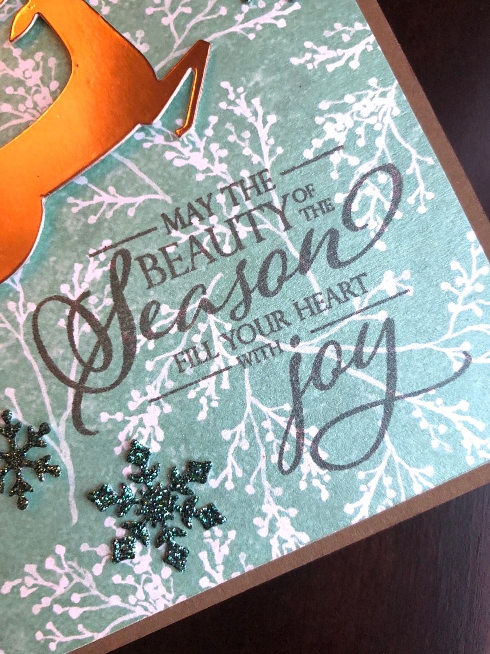 Any of the Joyous Noel DSP would be suitable to use for this card — the backs are as gorgeous as the fronts! Look at the beautiful copper foil touches!