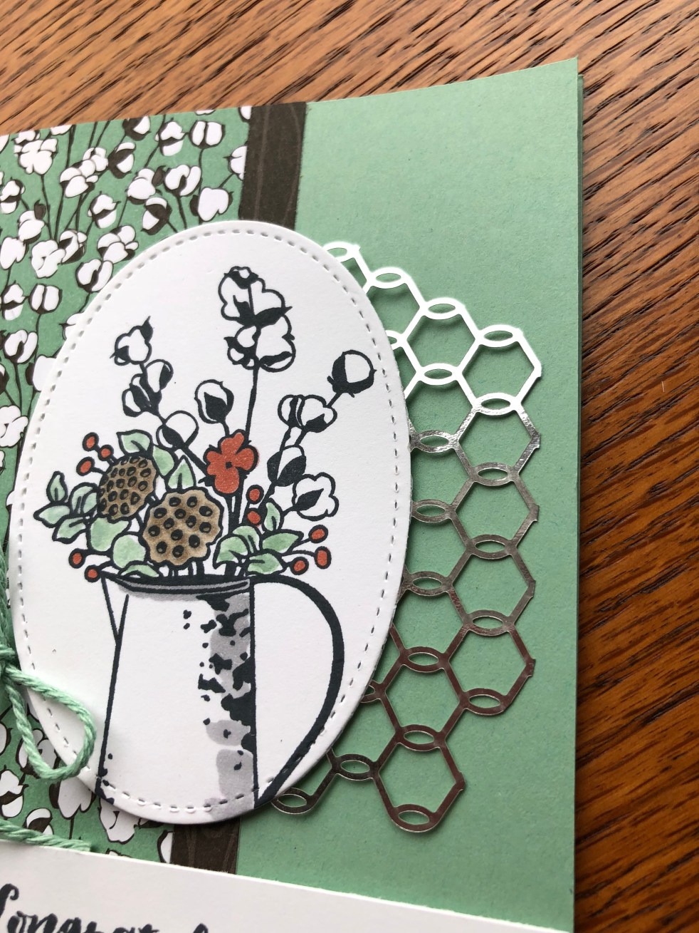 The first card has pretty green and white vellum leaves and some pretty silver and pink baker’s twine. Look at the detailing!