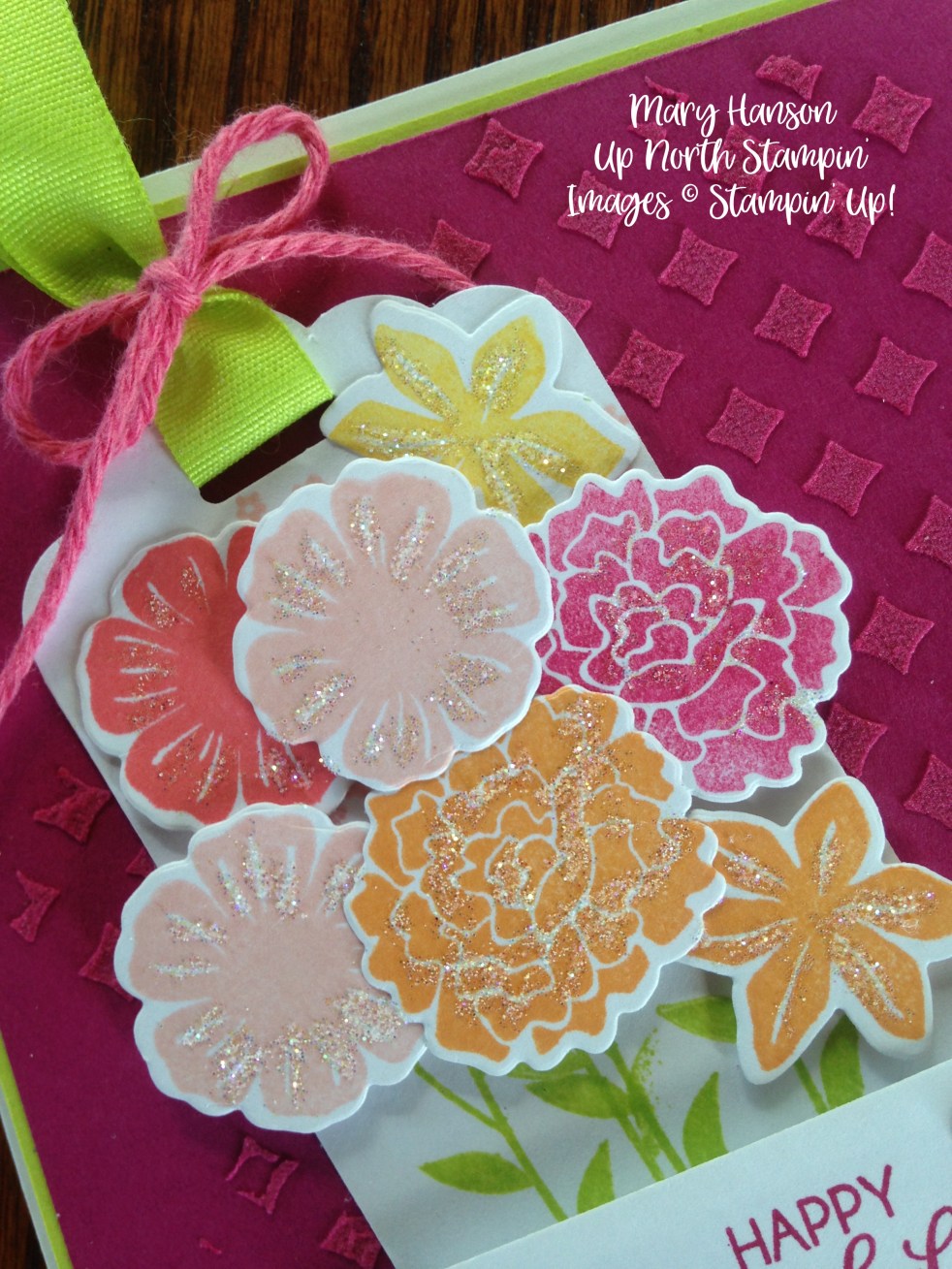 For this tag card, I started with a Shimmery White Card Stock base and then a layer of Lemon Lime Twist and a layer of Berry Burst cardstock upon which I built my tag. I used the Beautiful Bouquet Photopolymer Bundle to create a small bouquet using the ink colors listed below in the Supply List. There’s no wrong answer — you create a bouquet using the flowers and colors that you’re in the mood for! After stamping the flowers, I cut out the various shapes using the thinlits from the bundle. I cut a two-inch strip of Shimmery White Card Stock to create the tag base. I punched the top and bottom with the Tag Topper and Triple Banner punch. I stamped some stems with Lemon Lime Twist ink, and then mounted the flowers — some with SNAIL adhesive, and some bumped up with Stampin’ Dimensionals to create some visual variety. So fun!
